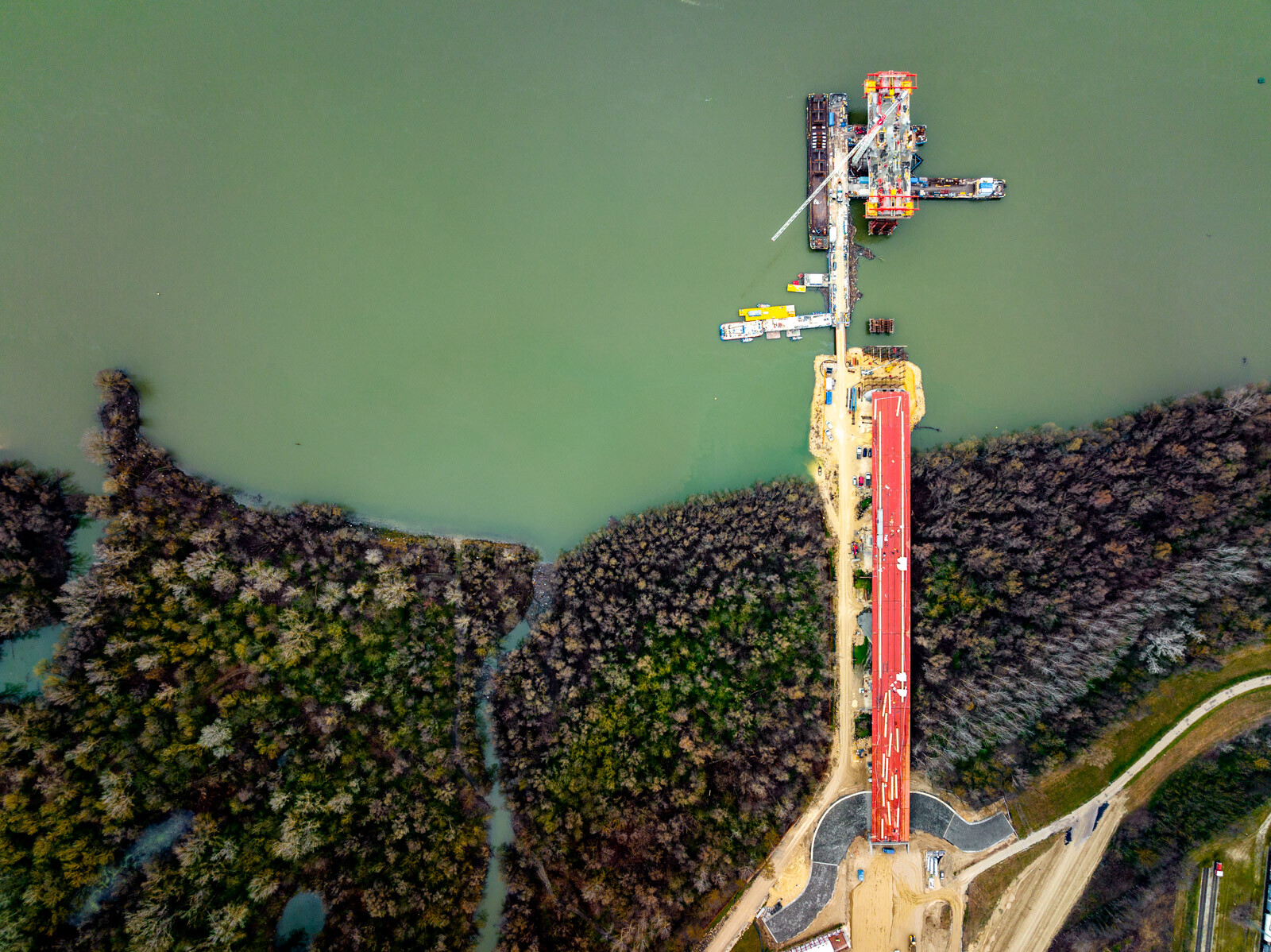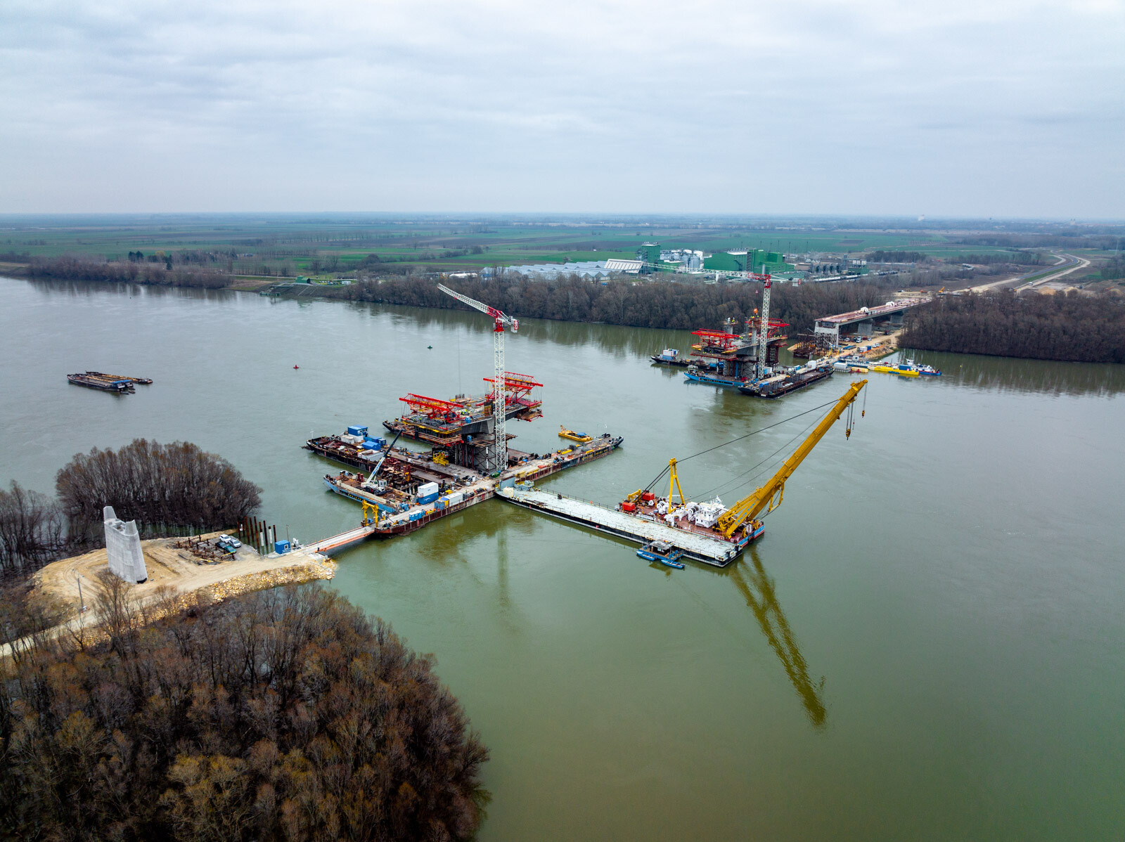 Egy további munkafolyamat is zajlik: ennek során a Duna fősodrásának új irányba terelését szolgáló vezetőműveket készíti el a kivitelező. Lapunk úgy értesült, eddig 31 000 tonna vízépítési terméskövet építettek be a mederbe annak érdekében, hogy az így létrejött terelőgátak a megépülő híd számára kedvező irányba tereljék a fősodort, csökkentve az új hídpillérek terhelését.