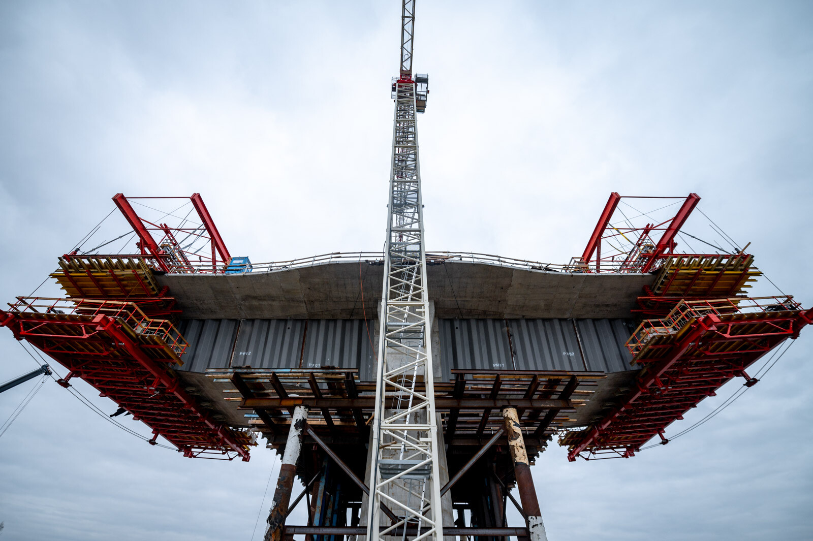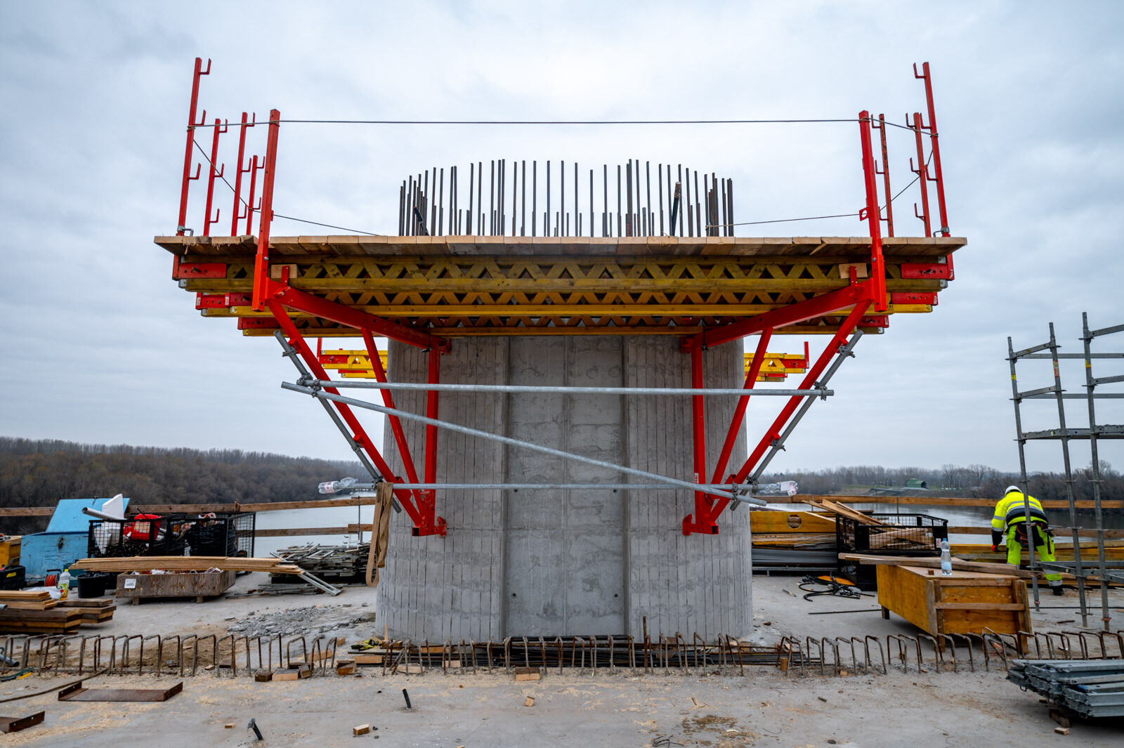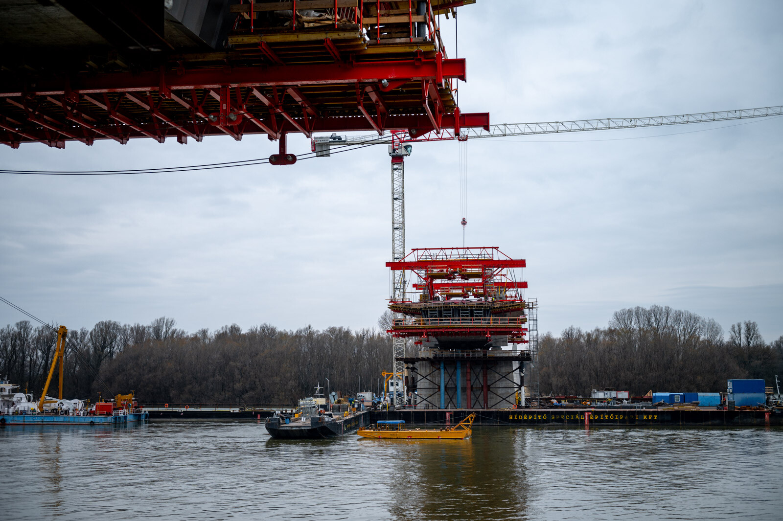 Ezzel párhuzamosan megkezdődött a pályaszint felett a négy pilon kivitelezése. A legelőrehaladottabb állapotban lévő pilon az aktuális vízszinthez képest már mintegy 41 méterre magasodik.
