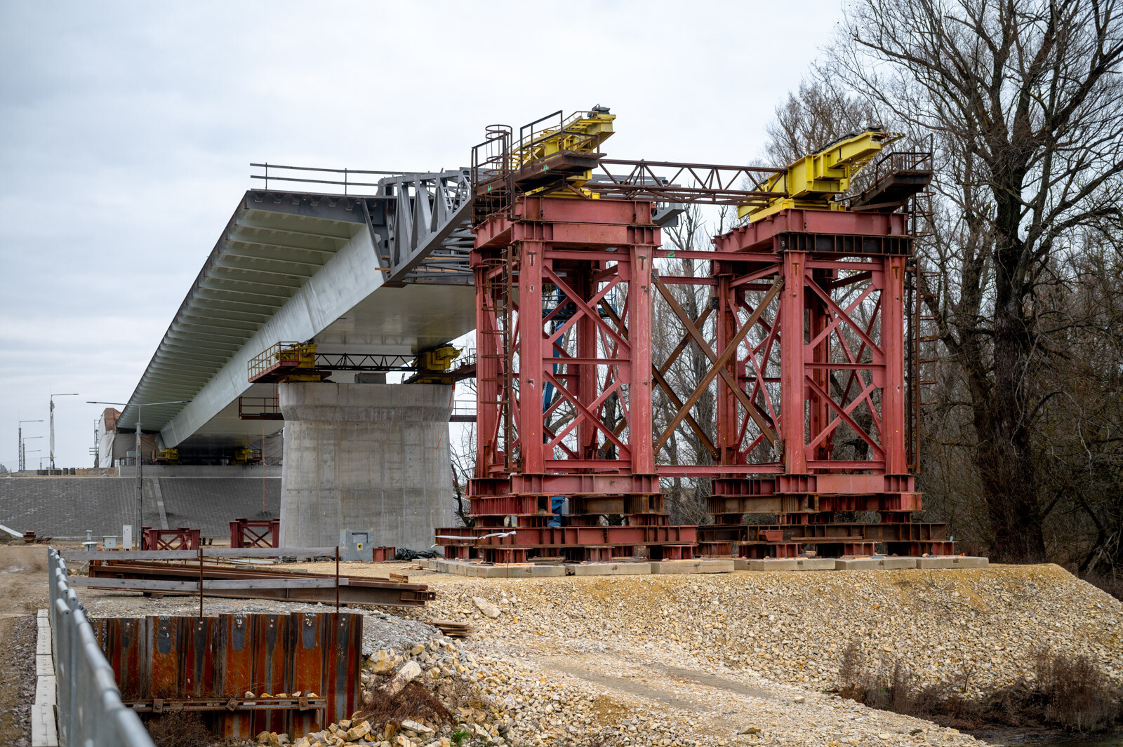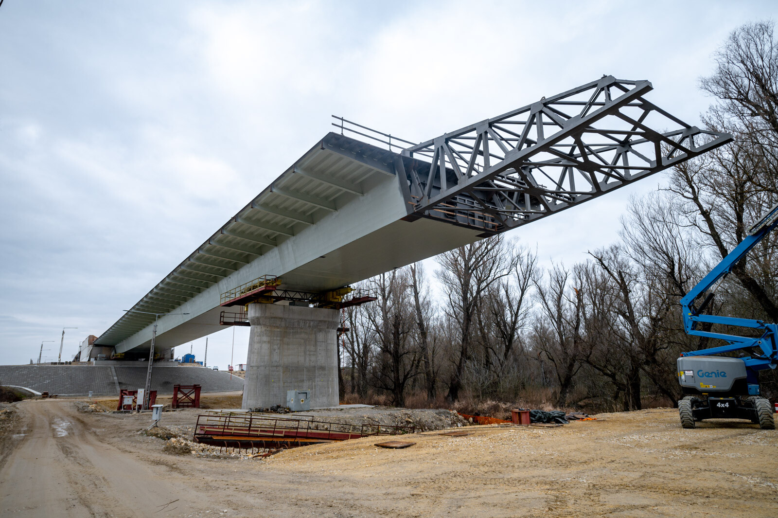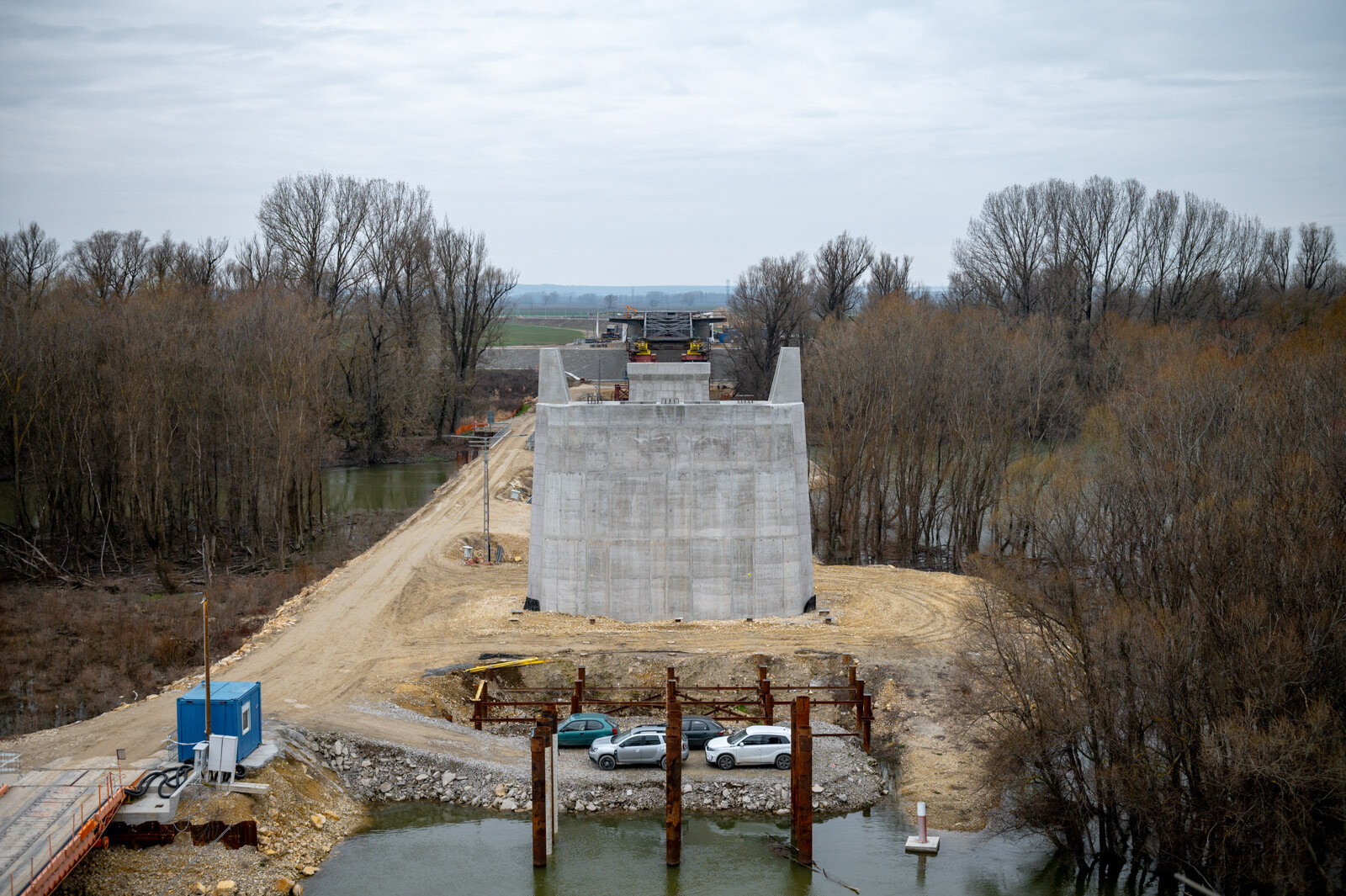 Szintén a bal parton történt előrelépés, hogy a főpálya alatt az árvízvédelmi gát kezelőútját átvezető vasbeton keretműtárgy szerkezetkész állapotban van. A jó időre tekintettel megkezdődött a műtárgyakhoz csatlakozó főpálya- és háttöltés tovább építése.