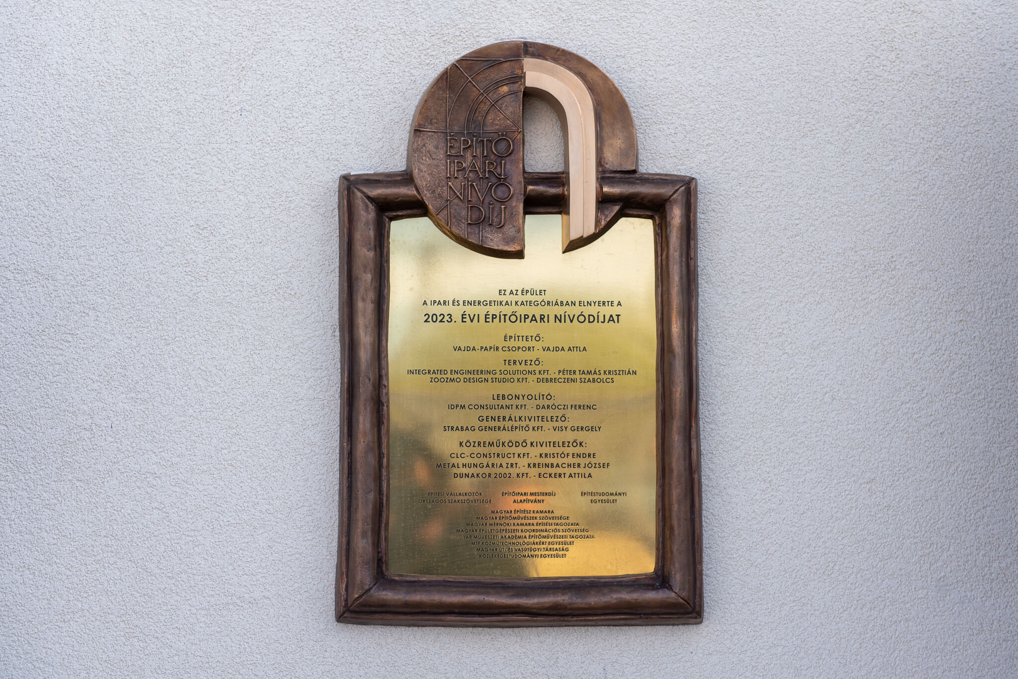 Bronztábla jelzi a Vajda-Papír Csoport dunaföldvári gyáregységének falán, hogy az épület Ipari és energetikai építmény kategóriában elnyerte az ÉVOSZ 2023. évi Építőipari Nívódíját. A beruházás generálkivitelezője a STRABAG Generálépítő Kft. volt.