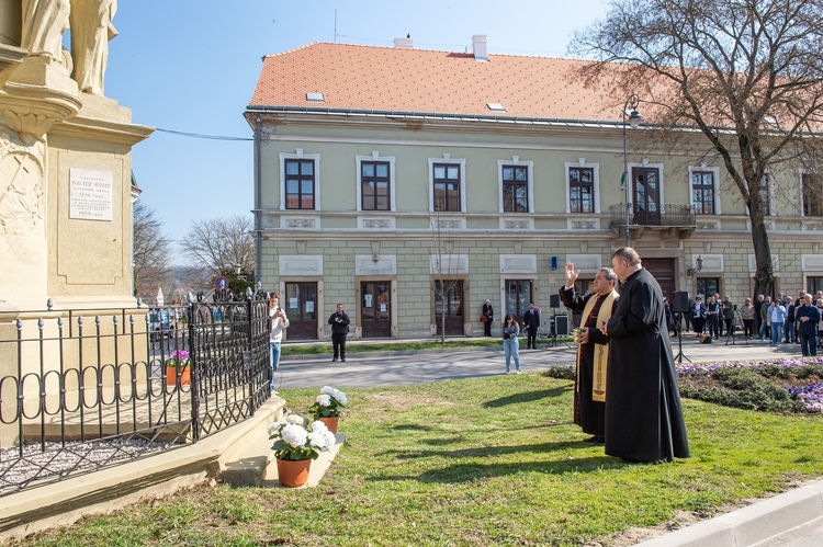A szobrot Felföldi László pécsi megyés püspök áldotta meg, aki azt mondta, hogy a 18. század járványai és tűzvészei után ma "szellemi, lelki járvány és tűzvész" van, és nincs más lehetőség, mint összefogni. A püspök elmondta XIV. Leó pápának a leszerelésért és a békéért mondott imádságát.