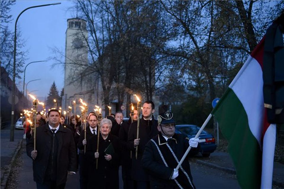 Salgótarján, 2015. november 4. Becsó Zsolt fideszes országgyűlési képviselő, Bérczesi Mihályné, a Magyar Politikai Foglyok Szövetségének (Pofosz) Nógrád megyei elnöke és Fülöp Attila, az Emberi Erőforrások Minisztériumának nemzetiségi és civil társadalmi kapcsolatokért felelős helyettes államtitkára (b-j) a nemzeti gyásznapon tartott fáklyás felvonuláson Salgótarjánban 2015. november 4-én, az 1956-os forradalom és szabadságharc leverésének 59. évfordulóján.